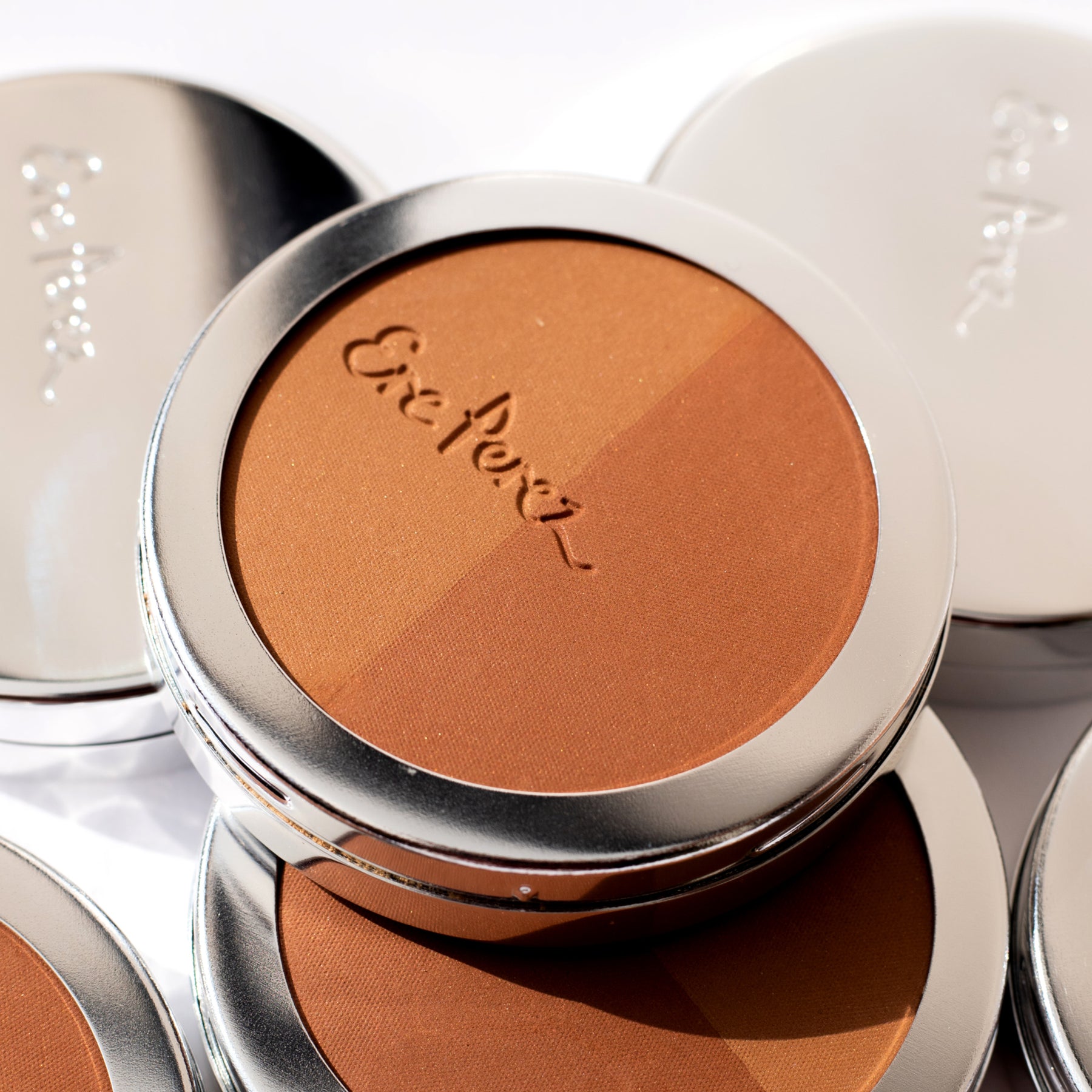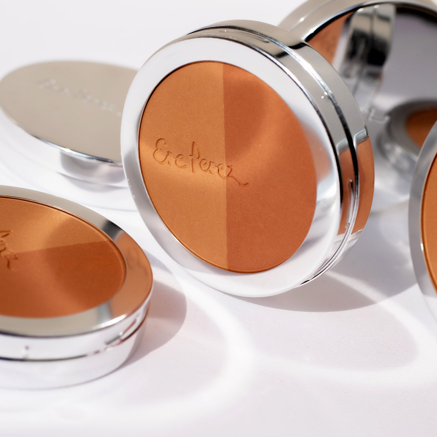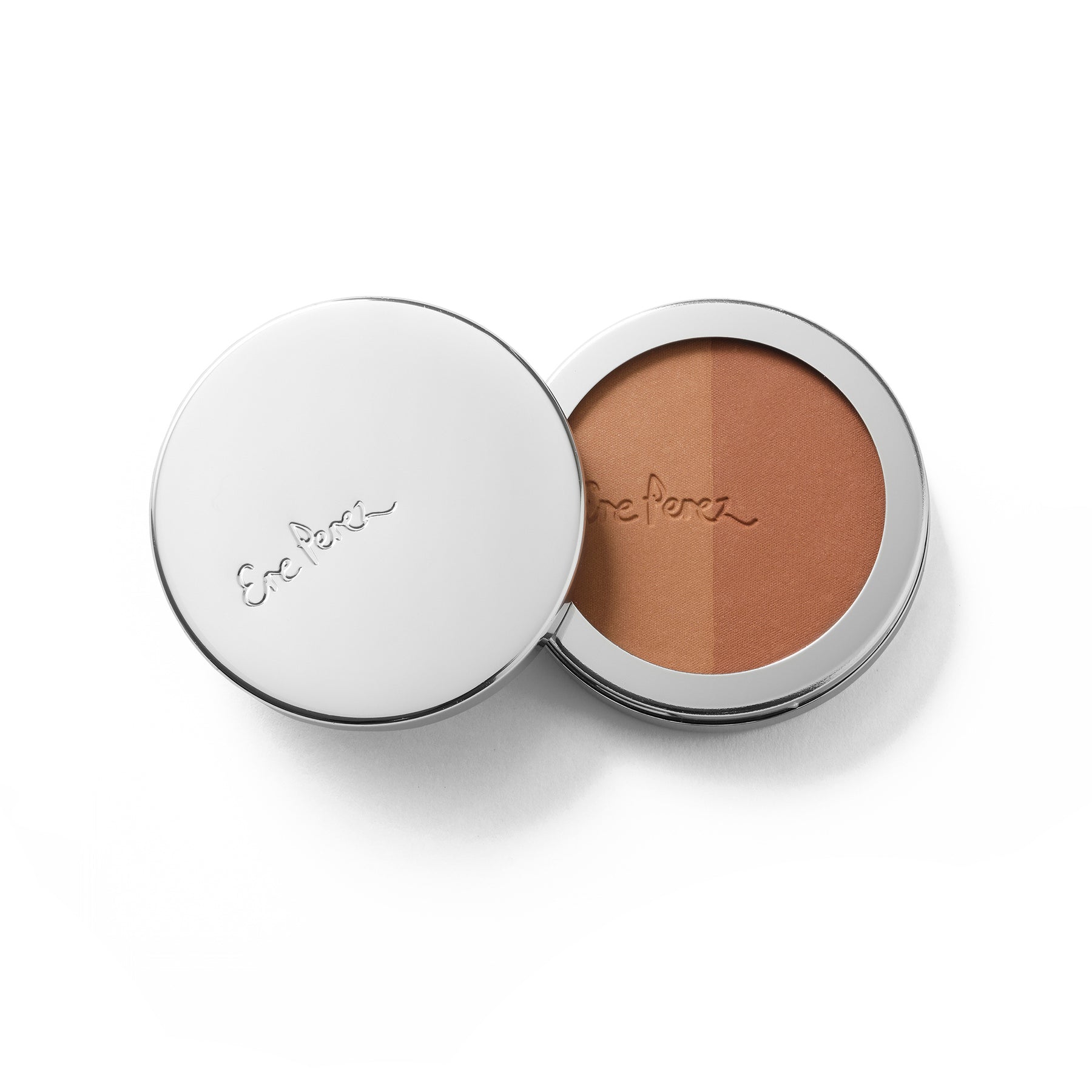 Swirl a brush such as the Ere Perez Eco Vegan Blush and Bronzer brush on each individual shade, tap excess and sweep across the apple of the cheeks and cheek bones for a natural flush of bronze colour. Or easily blend and combine both shades for all-over buildable blush colour.