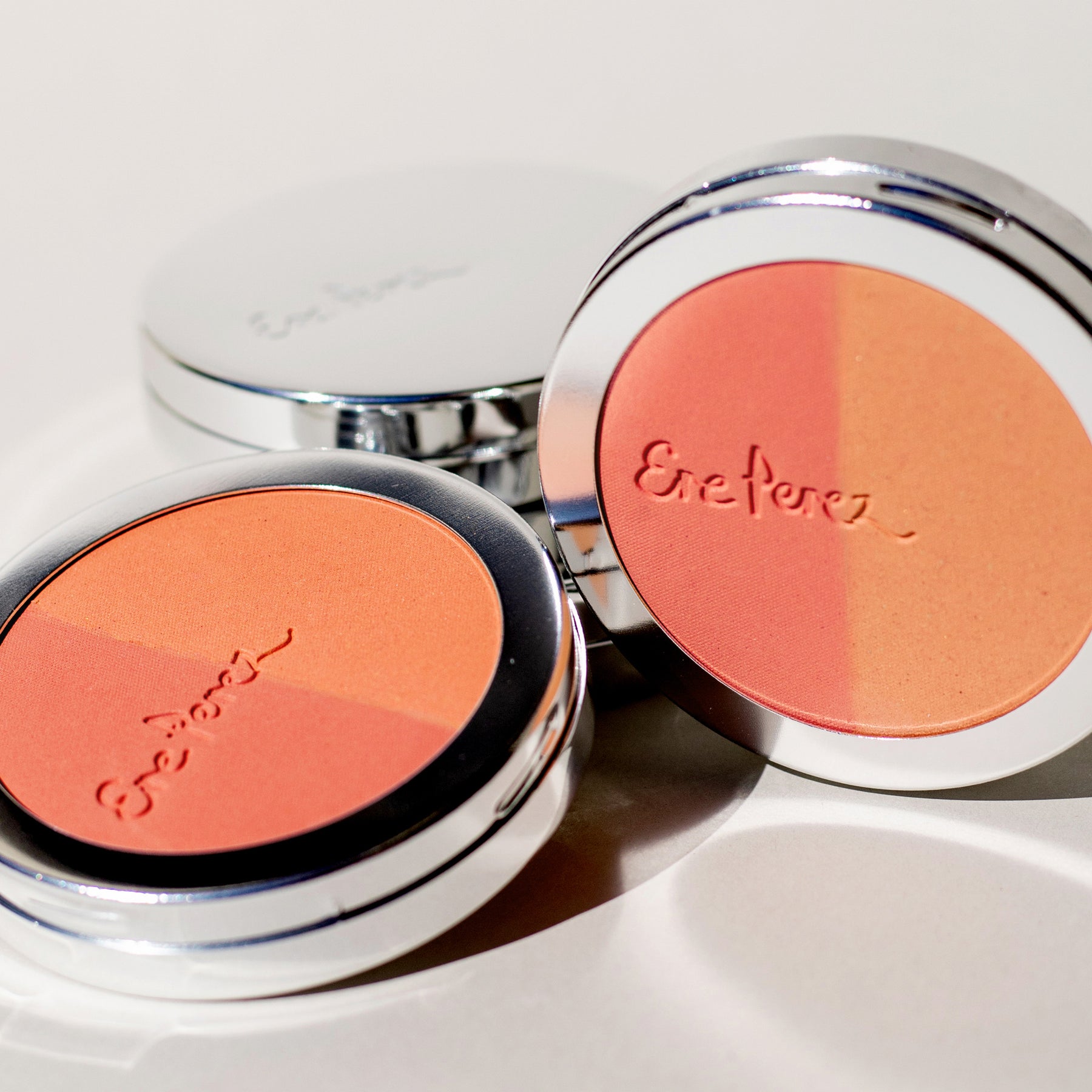 Swirl a brush such as the Ere Perez Eco Vegan Blush and Bronzer brush on each individual shade, tap excess and sweep across the apple of the cheeks and cheek bones for a natural flush of colour. Or easily blend and combine both shades for all-over buildable blush colour.