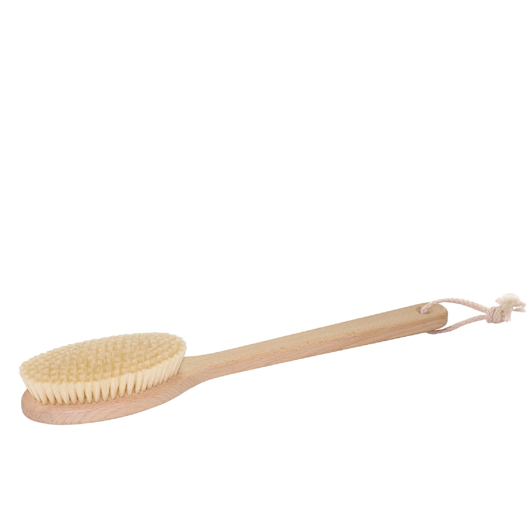 An oiled Beechwood bath brush with a long fixed handle and soft natural bristles.