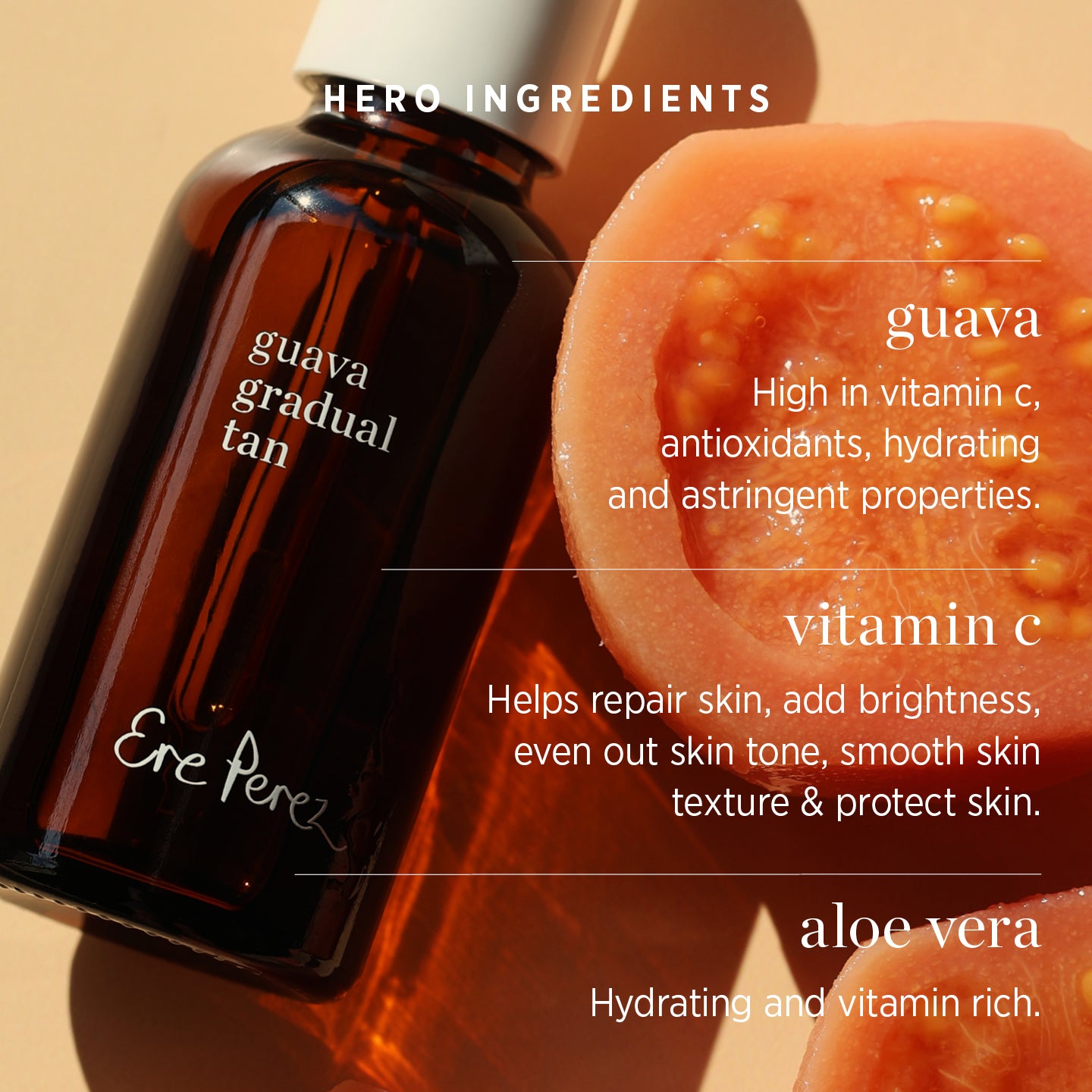 Maintain flawless skin and deliver a natural, safe, sunless radiance all year-round, with the Ere Perez Guava Gradual Tan. With a water-based, toxin free formula, it gives the face an effortless natural tan with the added benefits of botanical, brightening Vitamin C that will maximise your glow.