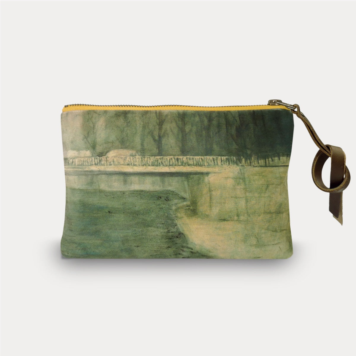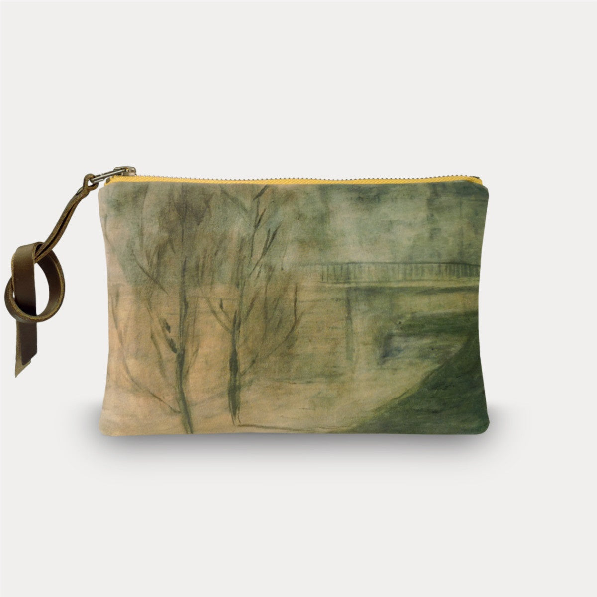 Finished with a zipper and a vegetable dyed brown leather handle.