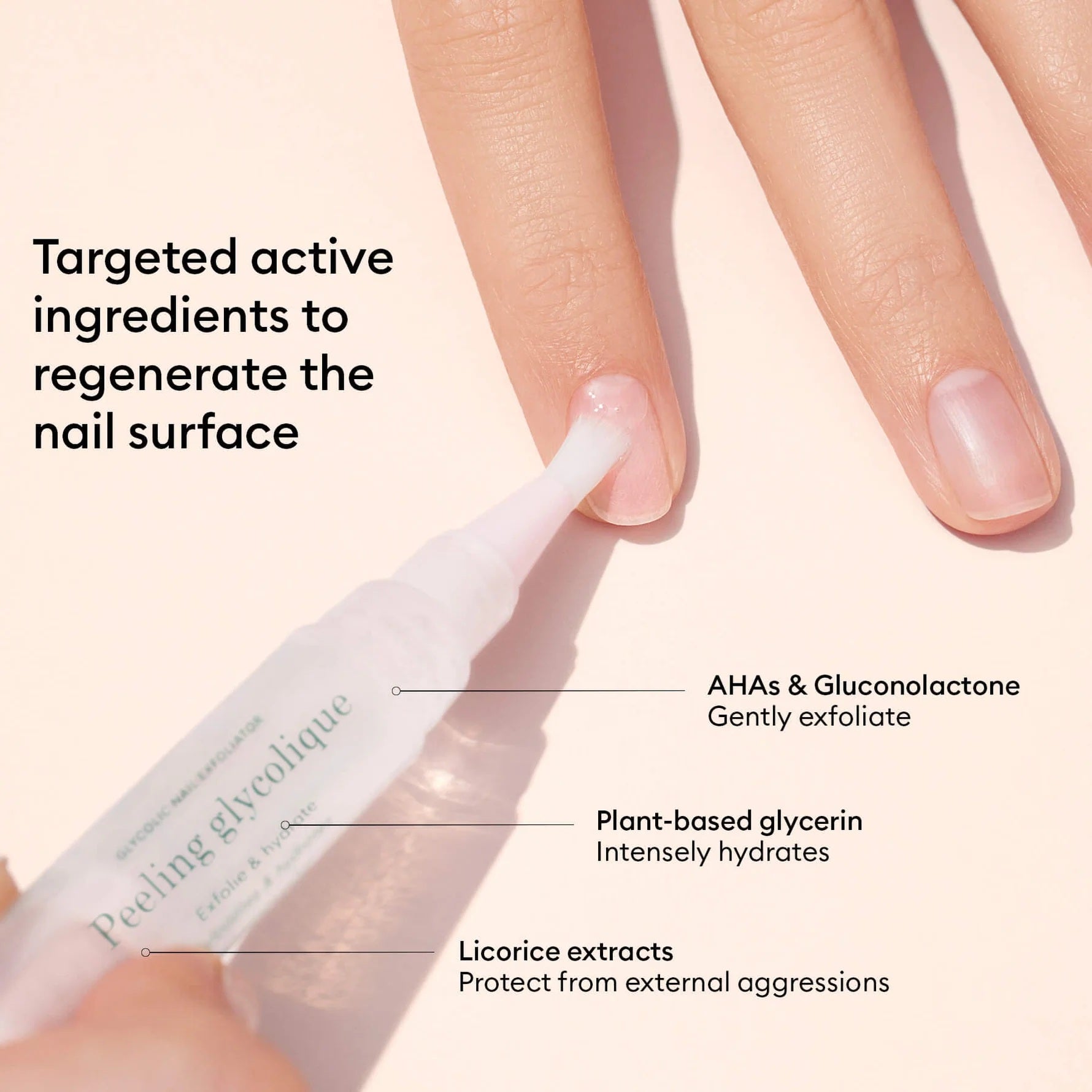 - Glycolic Nail Exfoliator: apply the product evenly on the bare nail surface, then massage until fully absorbed to gently exfoliate. The formula naturally absorbs, no need to rinse or wipe off.