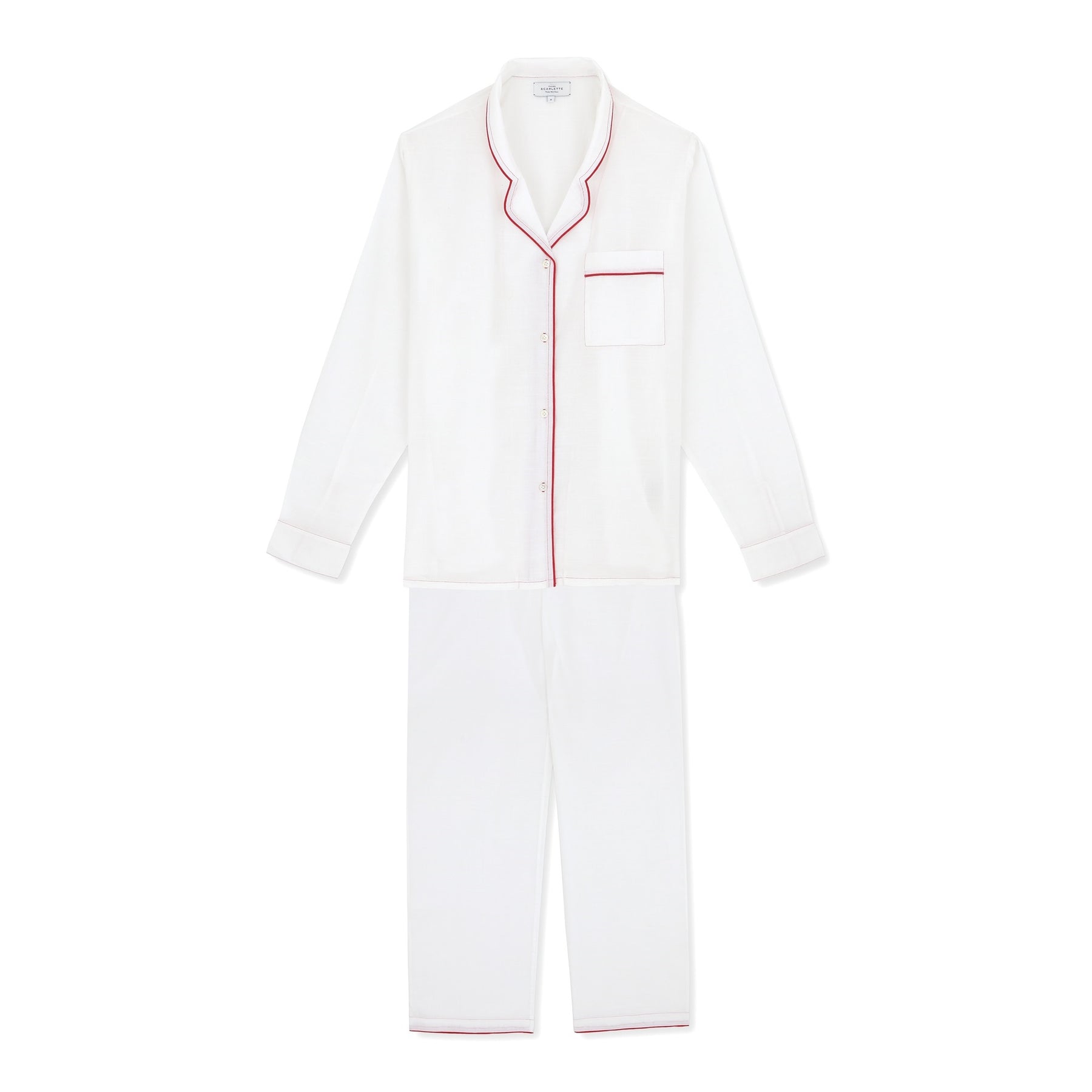 Long-sleeved jacket and soft pants with contrasting bias finish.